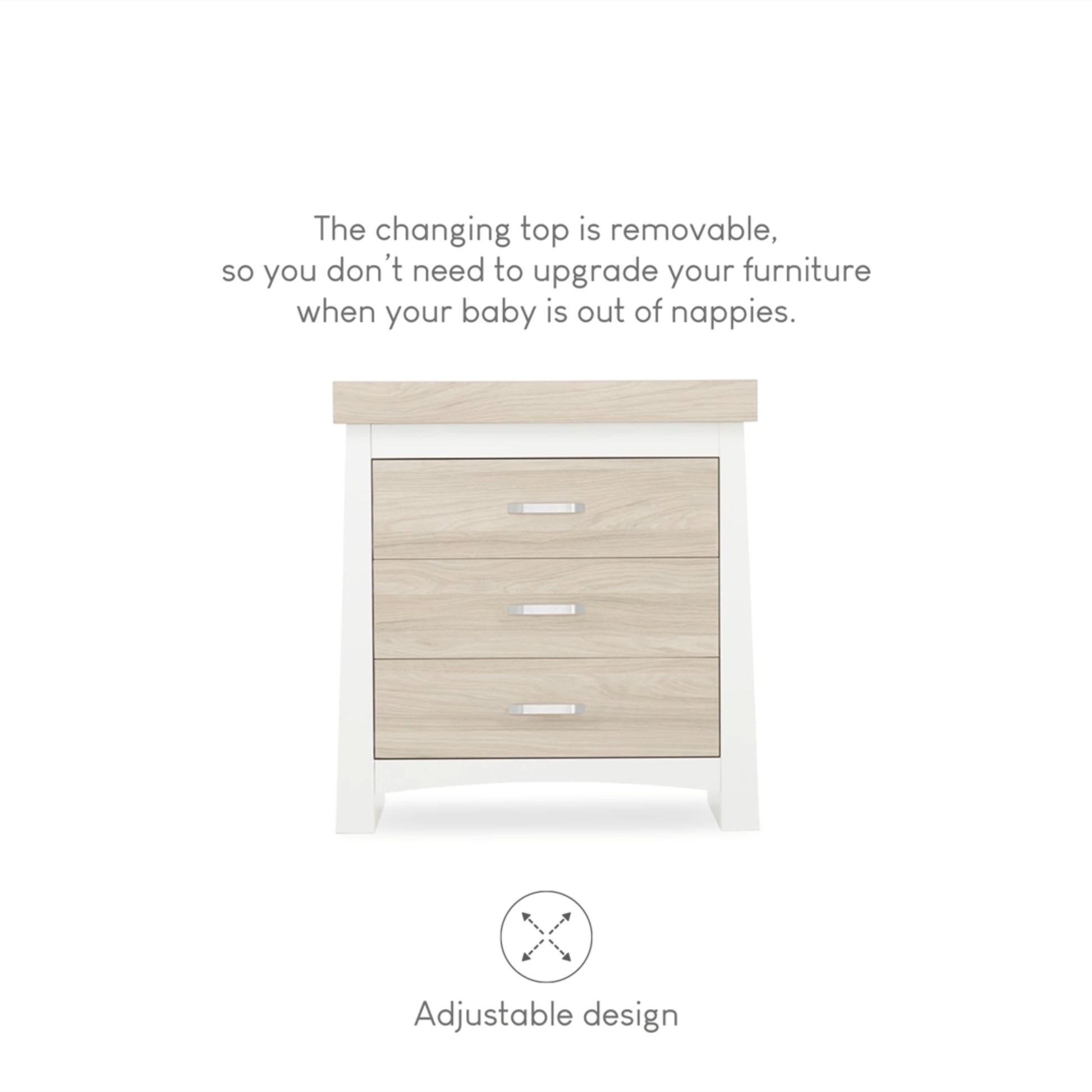 The Ada Dresser Changer is designed with sleek, modern lines and a soft ash finish that gives it timeless appeal. This versatile piece is perfect for any nursery, effortlessly blending contemporary style with a touch of classic charm. It features three spacious drawers with brushed metal handles, offering stylish and practical storage for all your baby essentials. With a removable changing top, the Ada Dresser Changer transitions smoothly from a changing station to a standalone dresser, making it a lasting piece for your home.