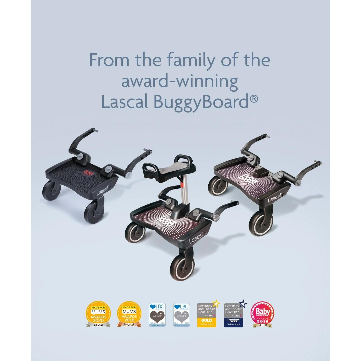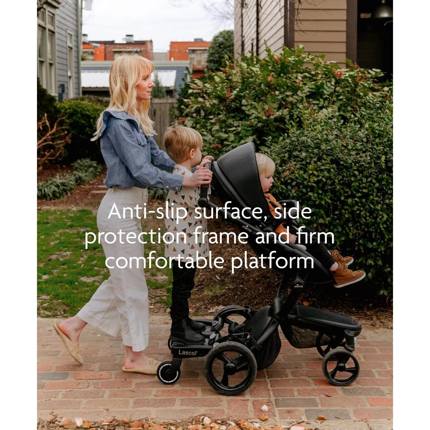 The Lascal Maxi offers your child a smooth and safe ride, while giving you full maneuverability. It features an extra-large anti-slip platform, higher ground clearance, and superior suspension compared to the Mini. This means more room for your feet, better control over rough terrain, and a secure grip for your child.