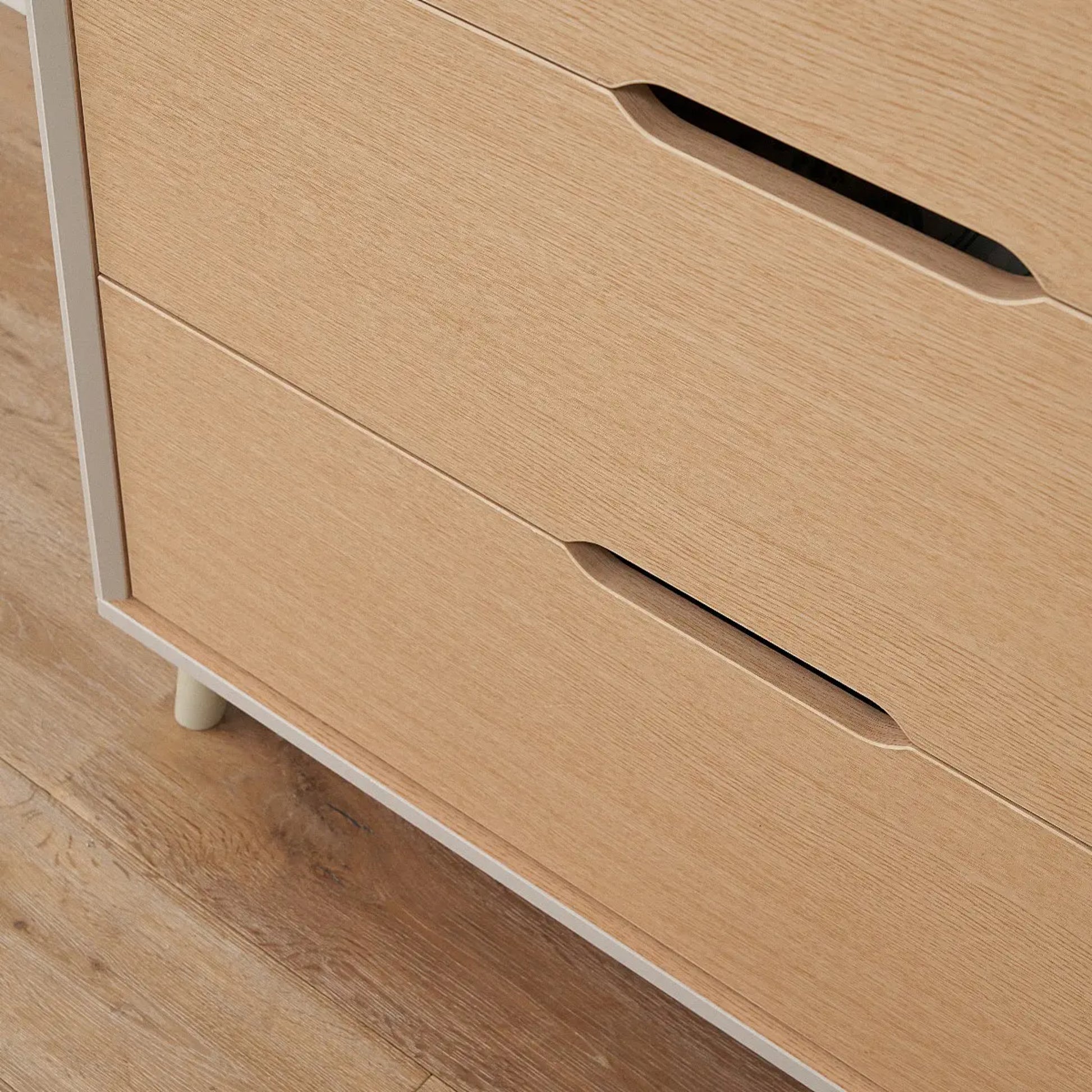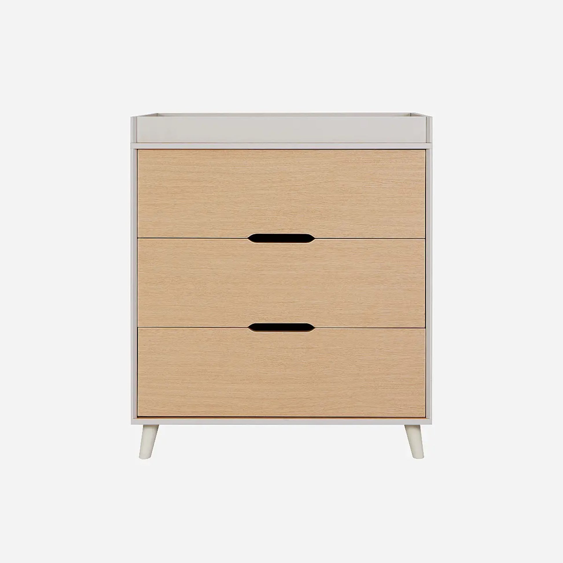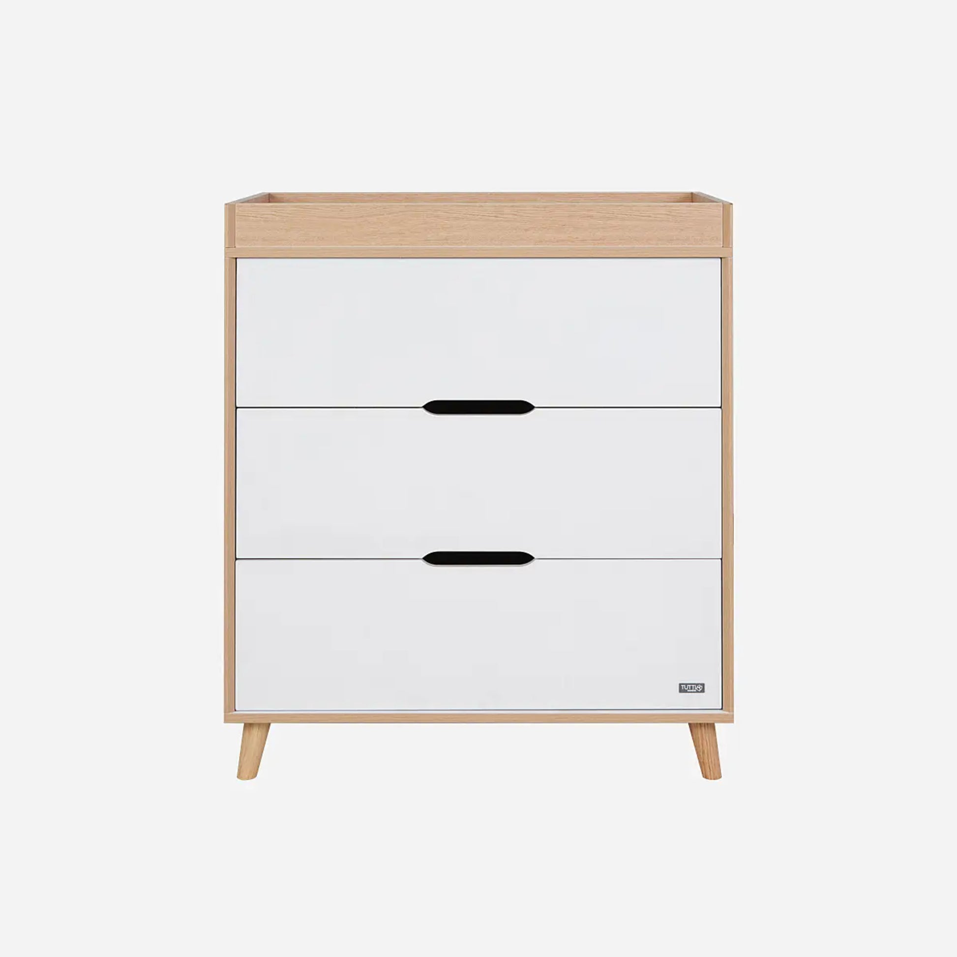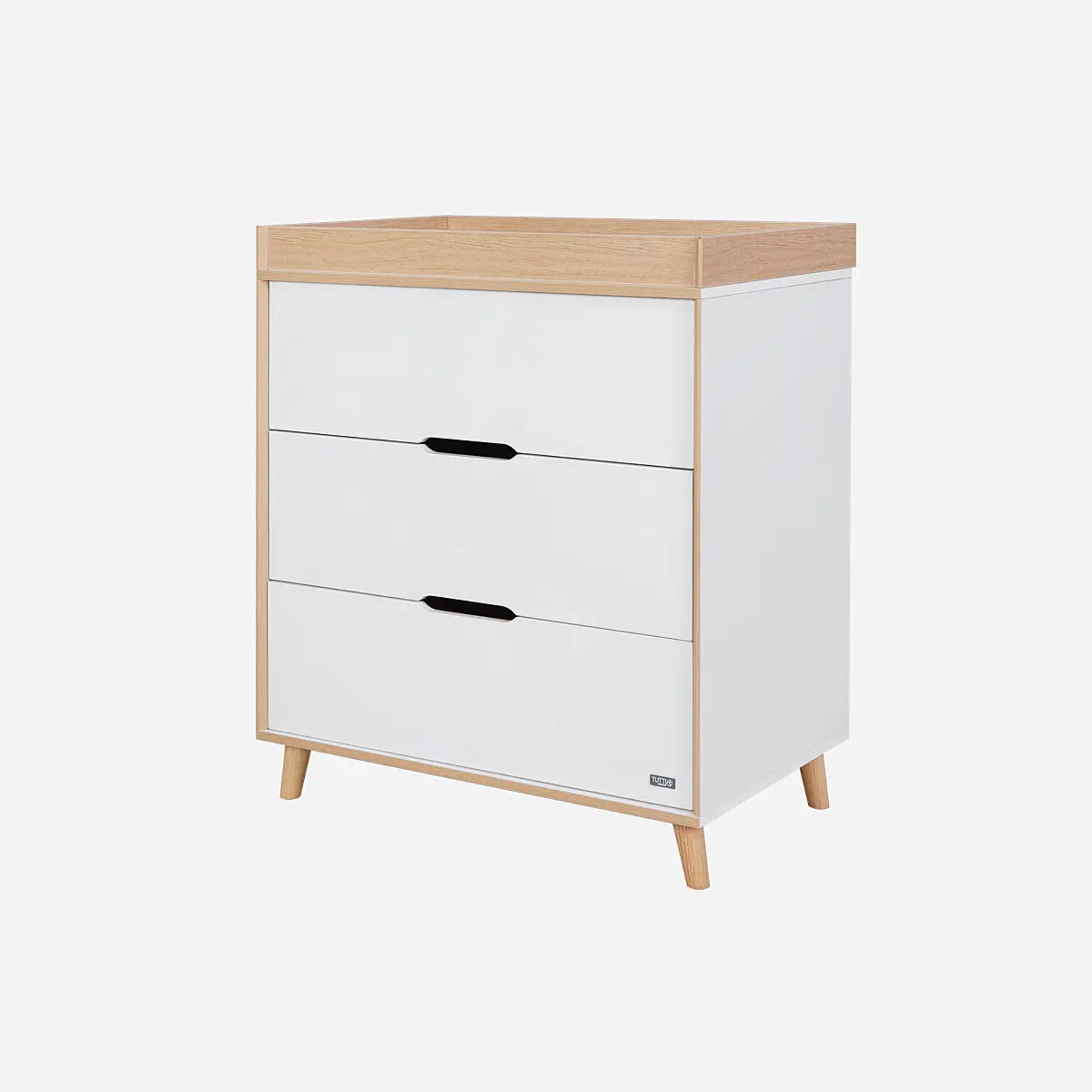 Introducing the Fika Chest Changer - a perfect blend of modern simplicity and functionality, inspired by Scandinavian design. With trendy splayed legs and sleek cut-out handles, it's just what you need for a minimalistic, contemporary nursery vibe. This chest combines style with practicality, providing a secure changing area and three roomy drawers to keep all your baby's necessities neatly organised.