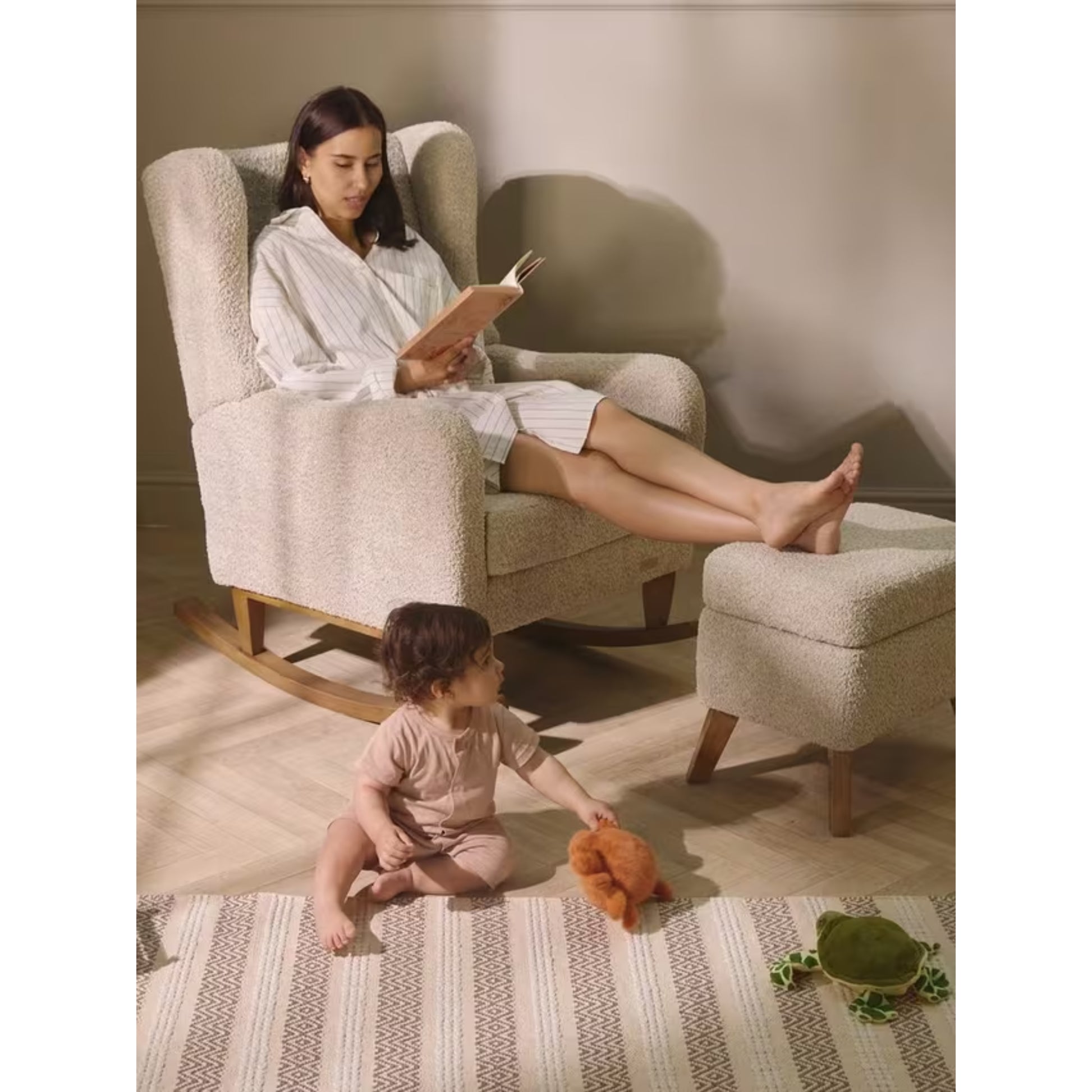 Sink into comfort with the Tutti Bambini Harper Wingback Rocking Chair & Storage Footstool—designed to cradle you through everything from the first feed to the last bedtime story. Its high back and cocooning side supports, paired with plush teddy fleece upholstery, make relaxation effortless.
